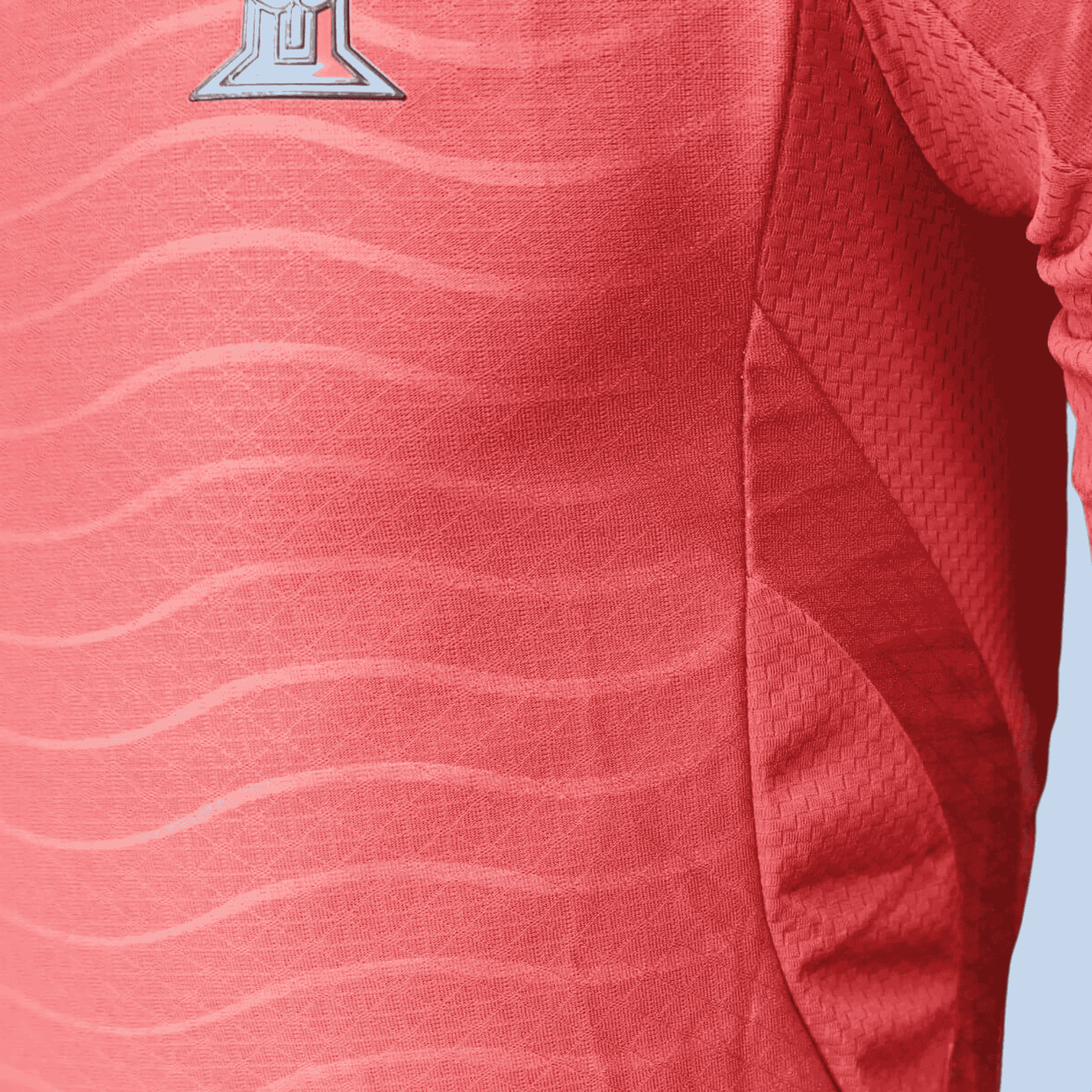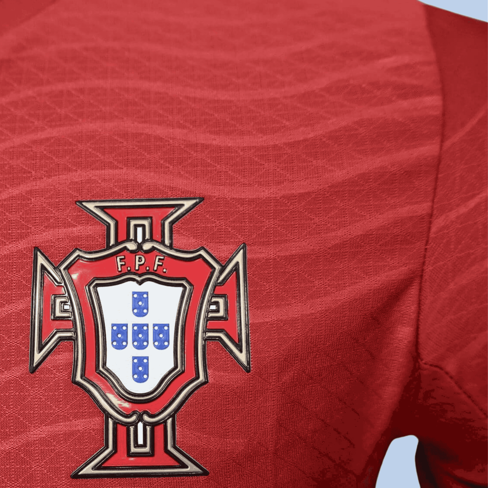 Celebrate the Seleção with the PORTUGAL 2026 World Cup kit in its player-version home shirt. A deep Portugal red base meets classic green trim at the V-neck and cuffs, finished with a precision wave-knit jacquard across the body and sleeves for motion and depth. The national crest sits proudly at the chest opposite the big cat mark, delivering a clean, modern profile that reads sharp from the stands to the spotlight.